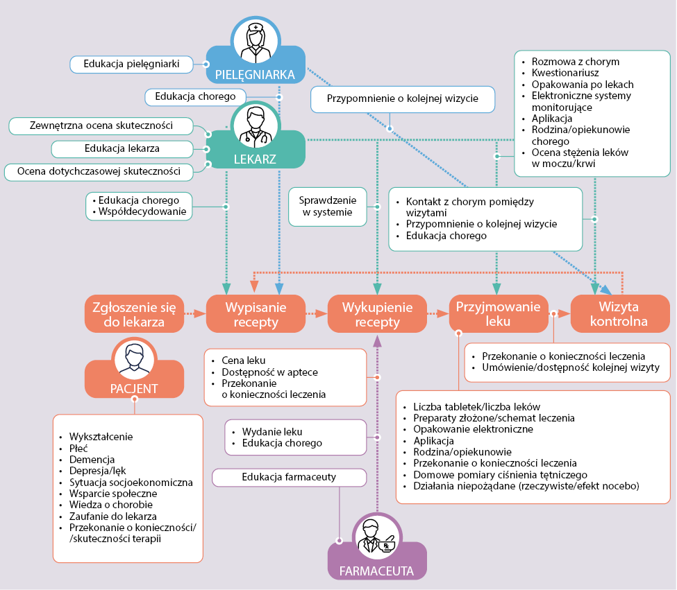 Jedną z najskuteczniejszych metod poprawy przestrzegania zaleceń i wytrwałości w leczeniu jest uproszczenie schematów leczenia. Stosowanie preparatów złożonych, które łączą kilka substancji aktywnych (np. na nadciśnienie i cholesterol) w jednej tabletce, wiąże się ze znamiennie lepszą kontrolą ciśnienia tętniczego i większym odsetkiem chorych osiągających cele terapeutyczne.[8]